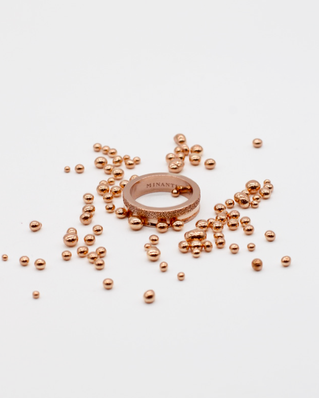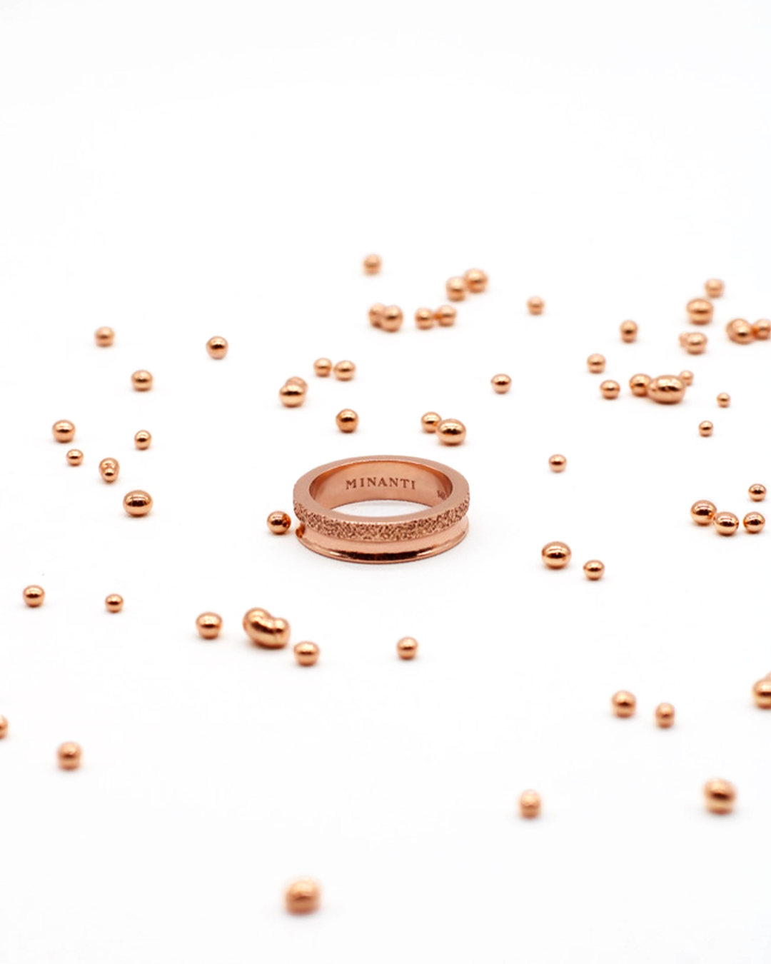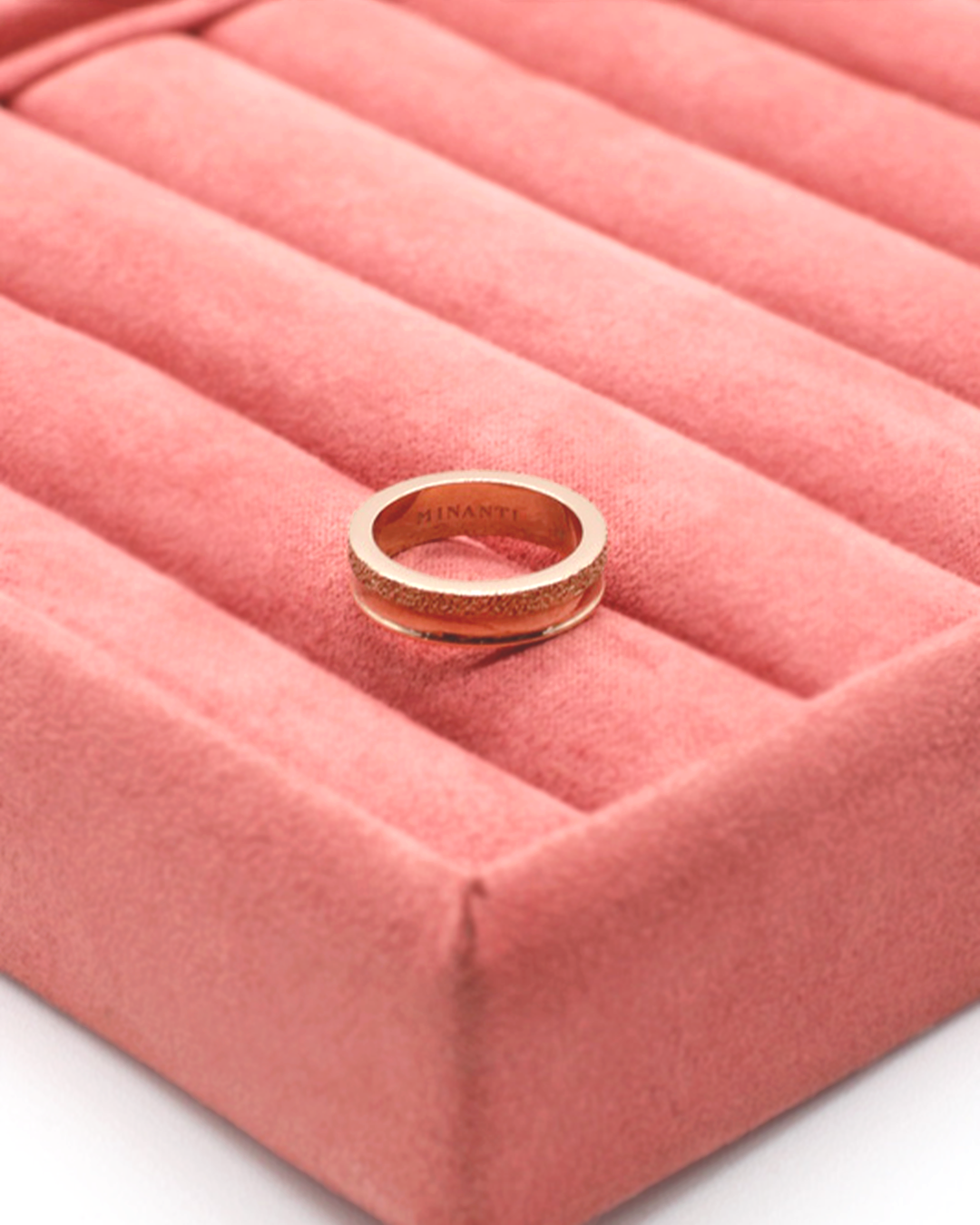El cuerpo del anillo tiene dos diseños en uno, en una mitad cuenta con un bajo relieve y en la otra mitad tiene textura, lo cual, hace que el anillo sea único.