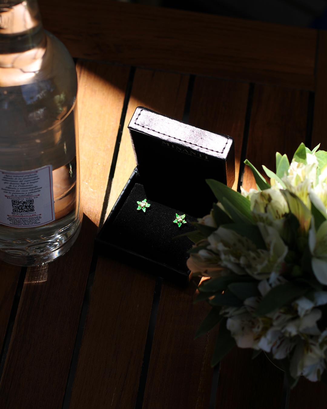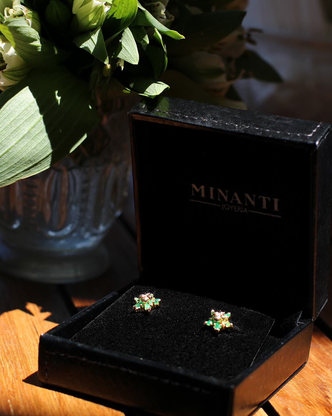 Arete de oro amarillo 14k con montadura de 5 pétalos de esmeralda en corte marquisee y una abeja central en relieve.