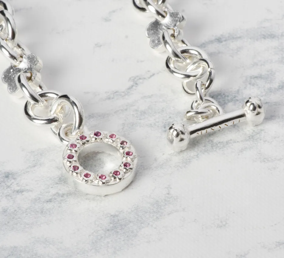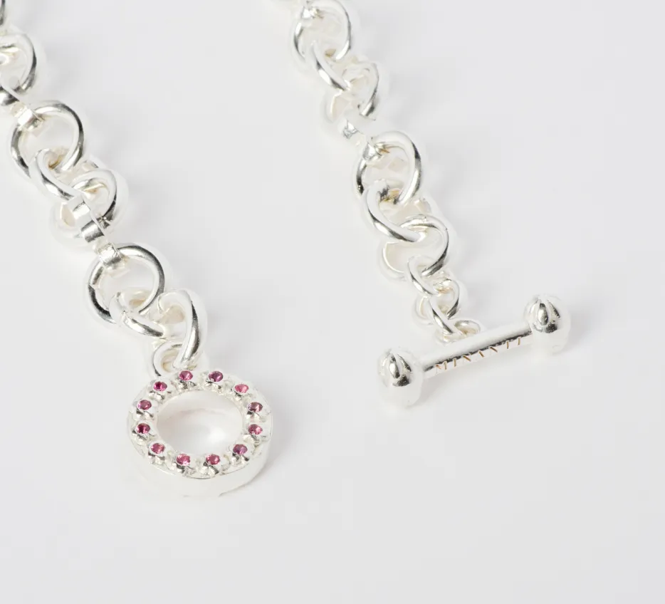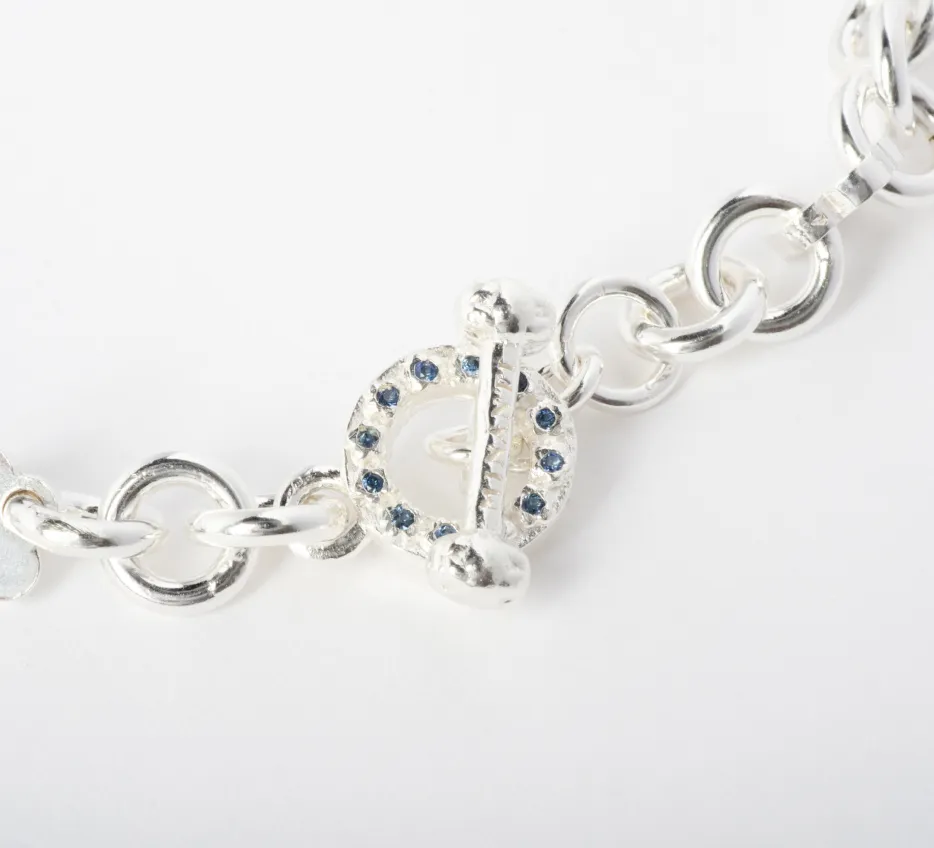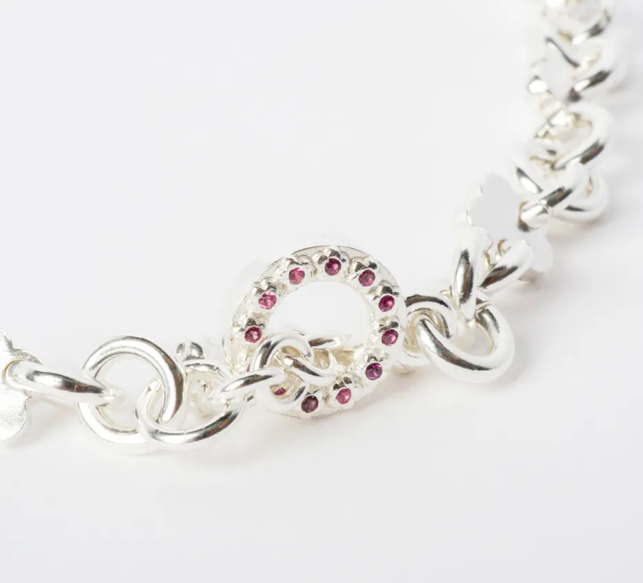 Collar de plata 940 de eslabones redondos con flores. Broche en forma de T y O con flores en ambos broches y 24 piedras redondas en el broche O. Las piedras pueden ser zafiros o rubies.