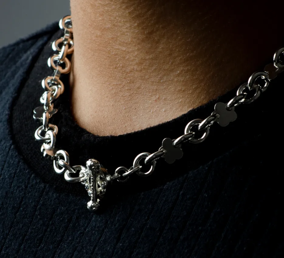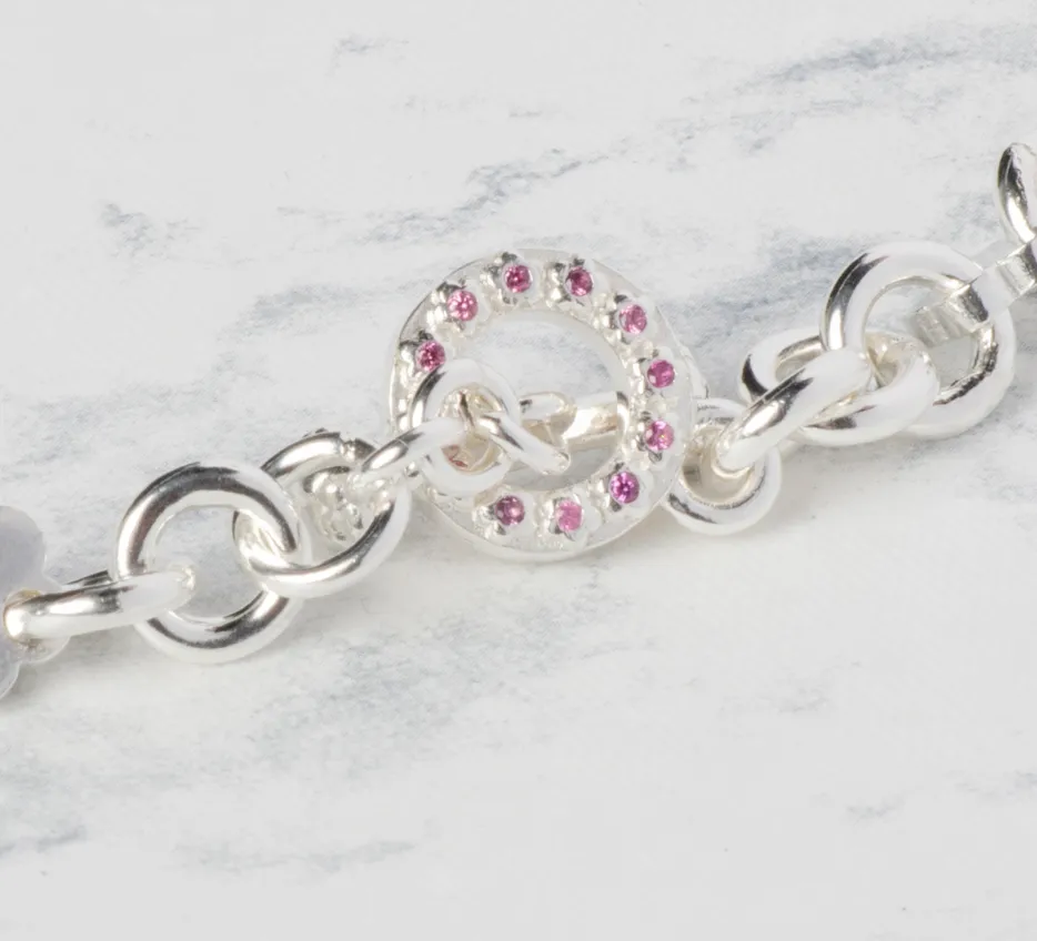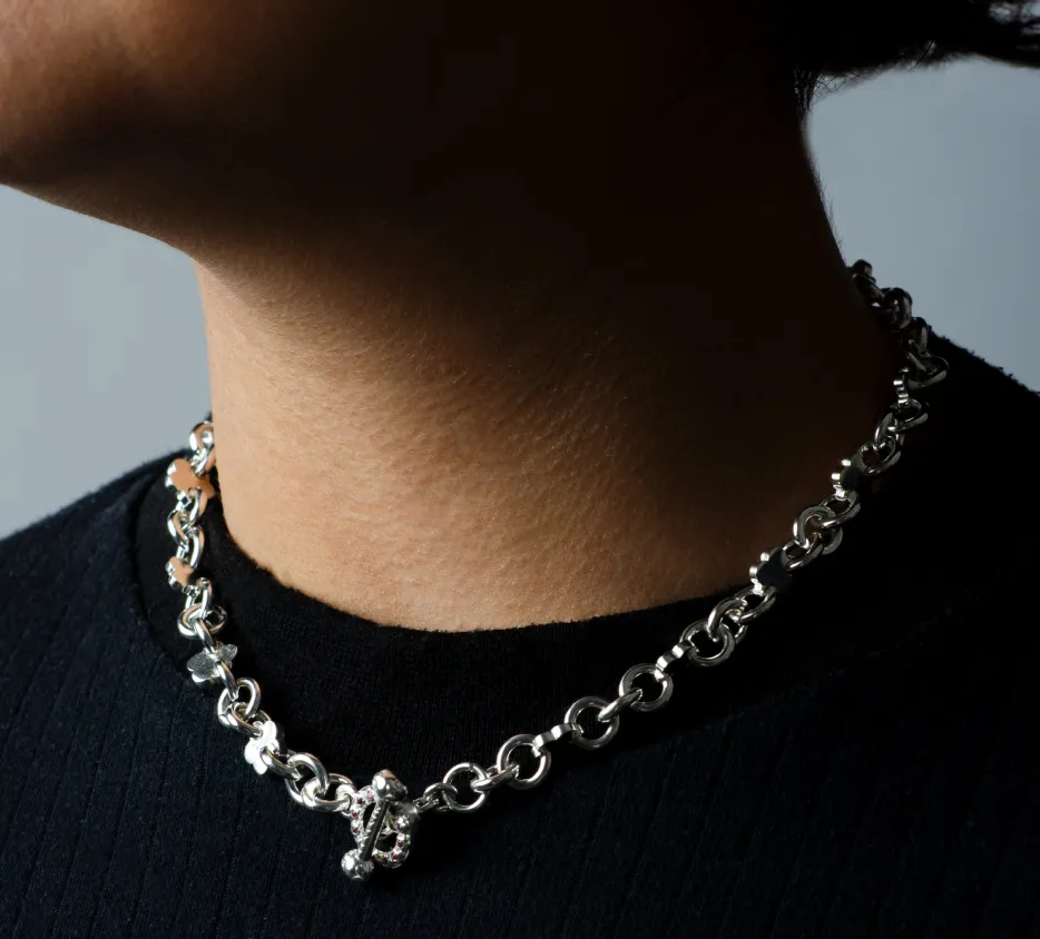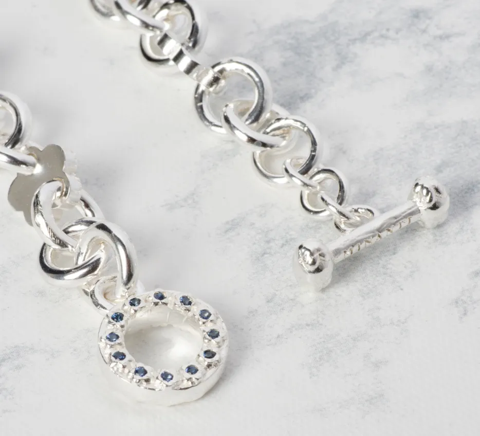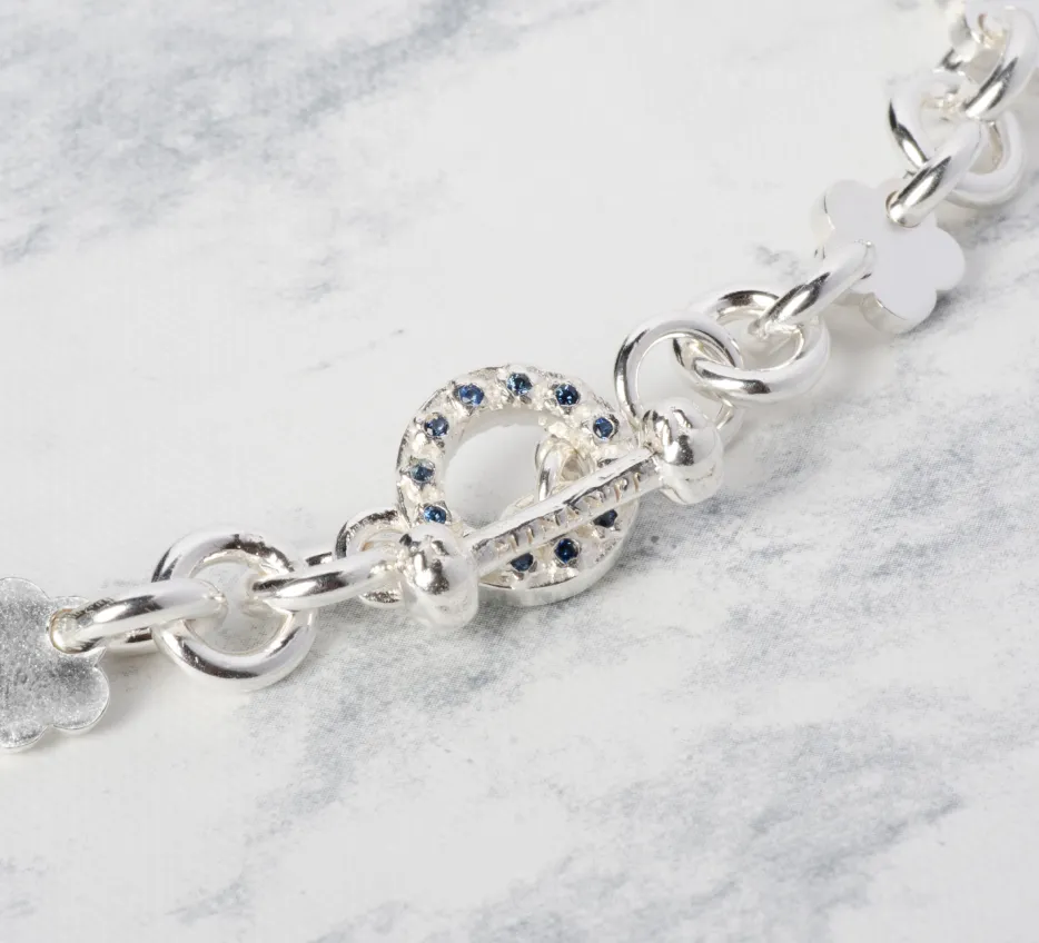 Collar de plata 940 de eslabones redondos con flores. Broche en forma de T y O con flores en ambos broches y 24 piedras redondas en el broche O. Las piedras pueden ser zafiros o rubies.